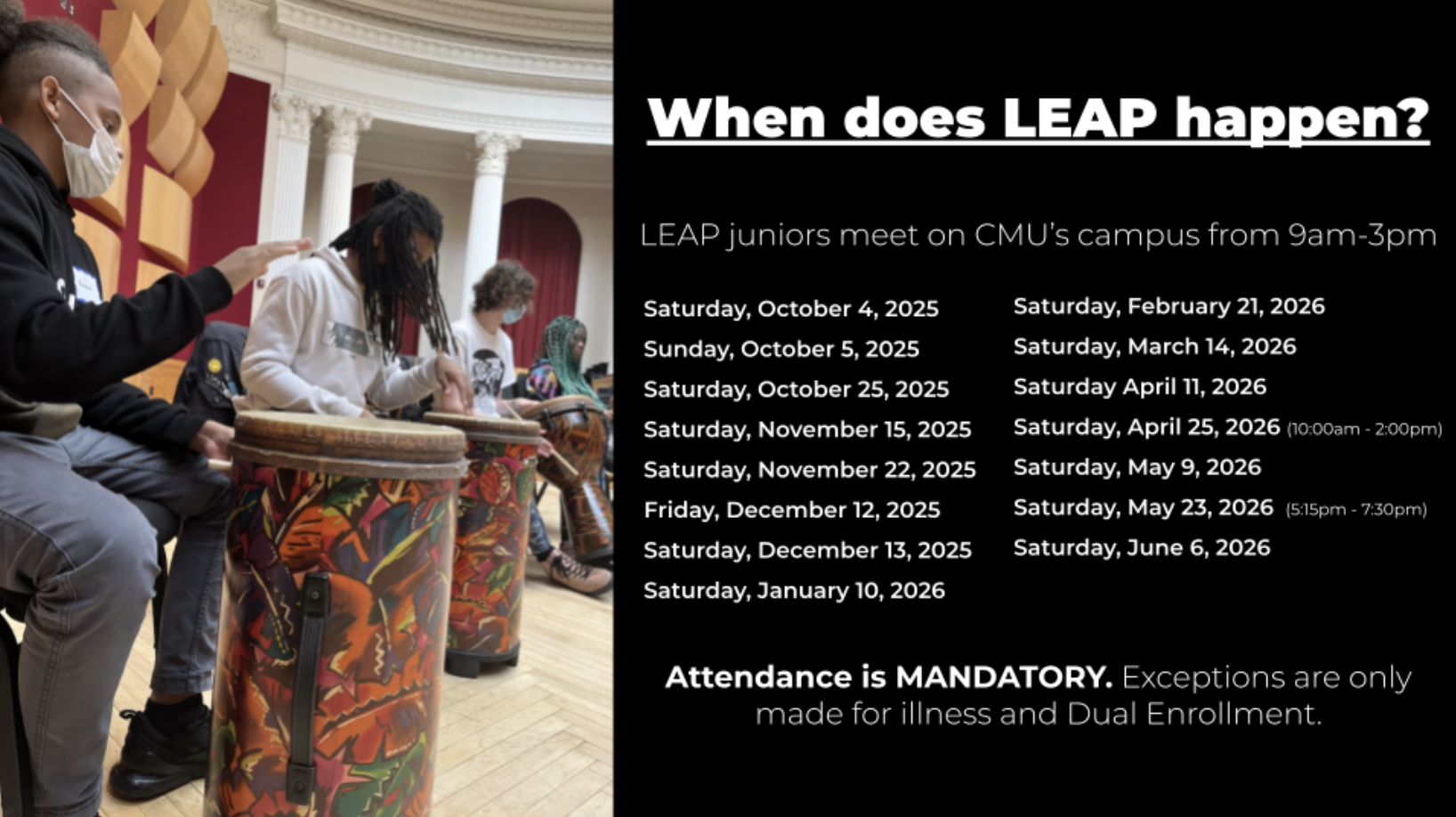 The Leadership, Excellence, Access, and Persistence (LEAP) Program is a dynamic partnership between Carnegie Mellon University's Dietrich College of Humanities and Social Sciences, the College of Fine Arts, and City High. LEAP offers an enriching, creative, and impactful advanced learning experience for our 11th and 12th grade students.