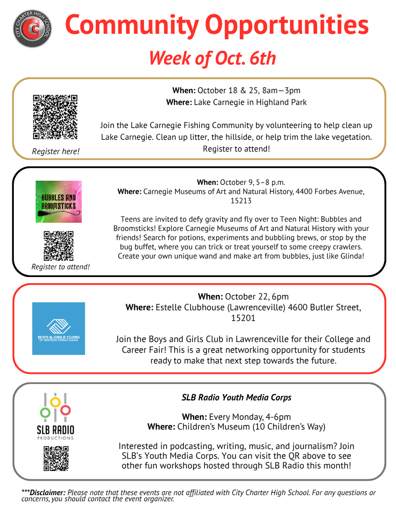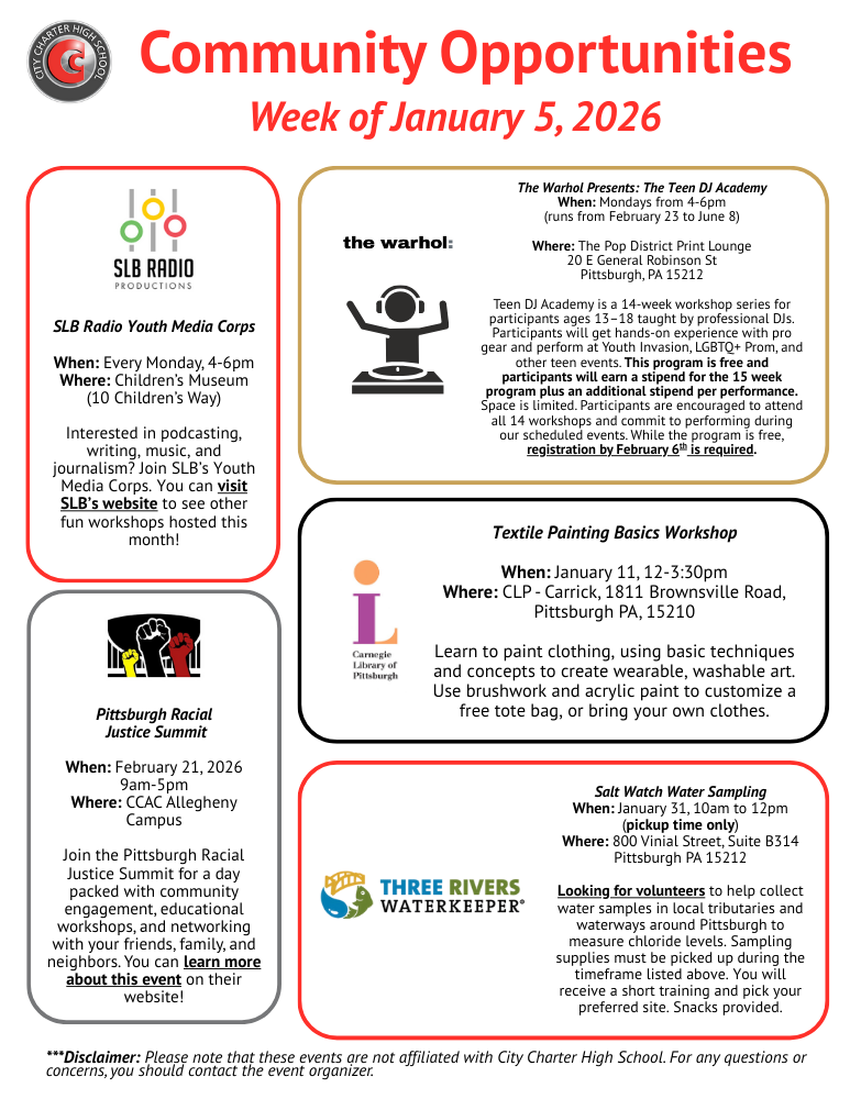 City High provides students with information about and access to a variety of community opportunities both during the school day and after school and on weekends. This page is updated every week to ensure accuracy!